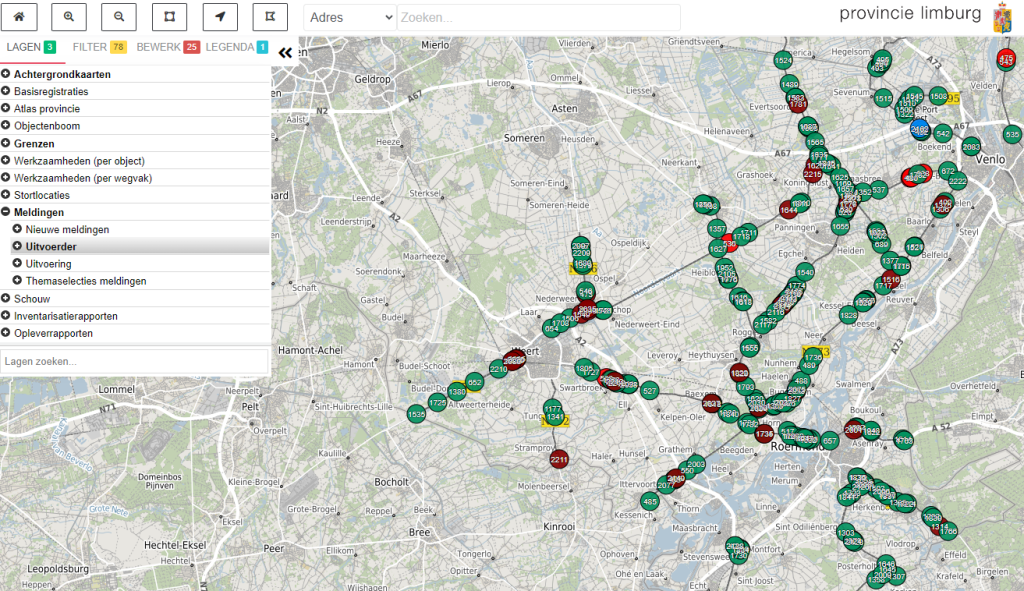 Henssen heeft Terralytics gevraagd om de KaartViewer voor dit project in te richten, inclusief bijbehorend dataportaal. Allereerst is hiervoor een PostGIS database ingericht. Hierin is door middel van diverse functies, triggers en views alles zo ingericht dat de eindgebruiker zo min mogelijk handmatig hoeft in te vullen. Zo wordt op basis van de locatie van een melding automatisch bepaald bij welk hectometerpaaltje de melding is geplaatst. De resultaten worden vervolgens via WMS en WFS(T) services aangeboden aan de KaartViewer. Daar zijn alle lagen verder ingericht zodat gebruikers alle informatie kunnen inzien, bewerken en toevoegen. Inmiddels wordt de kaart continu door een groot aantal ploegen, toezichthouders, uitvoerders en opdrachtgever gebruikt.