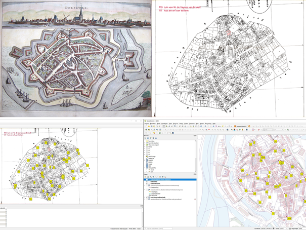 Bij het georefereren zijn diverse oude kaarten over de huidige kaart heen gelegd om ze met elkaar te kunnen vergelijken. Een hele uitdaging aangezien de verhoudingen van iedere kaart flink varieert! Zo was één van de kaarten getekend in vogelvlucht perspectief. Dit zorgt ervoor dat alle hoeken vervormd wanneer het over een 2D-bovenaanzicht wordt gelegd.