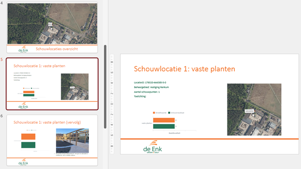 Als eerste actie wordt alle schouwresultaten opgehaald uit de database van de Enk. Daarna wordt in een aantal stappen een Powerpoint-rapport opgebouwd. In dit geval is voor Powerpoint gekozen omdat Powerpoint nog achteraf te bewerken is en omdat het goede opties biedt voor een strakke uitlijning van de inhoud.