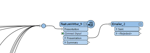 Alle PowerPointStylers komen vervolgens direct bij de Writer uit. In dit geval heb ik gekozen voor een FeatureWriter zodat ik direct een mail kan sturen zodra het bestand gereed is.