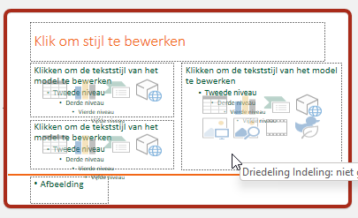 De FME workspace maakt zoals hierboven al beschreven gebruik van een Powerpoint template. Het is mogelijk om een standaard template te gebruiken, maar in de meeste gevallen is het handiger om zelf een template te maken. De template bevat geen dia’s maar alleen het diamodel. Dit model bevat de locaties van mogelijke tekstvakken en afbeeldingen.