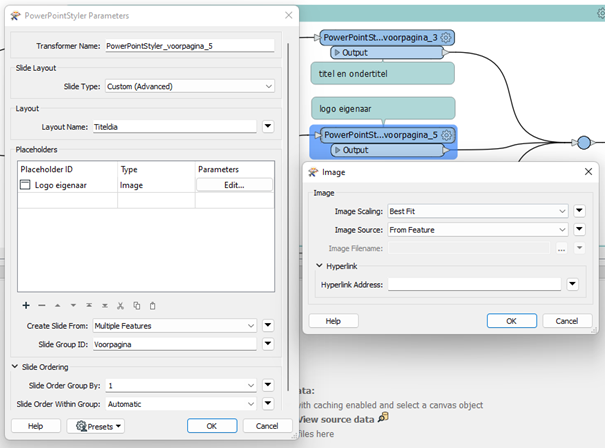 Voor de logo’s zijn dezelfde stappen doorlopen. Bij dit specifieke voorbeeld is de logo voor de beheerder en eigenaar hetzelfde, maar dit kunnen ook twee verschillende afbeeldingen zijn. Het is in ieder geval belangrijk om scherp te hebben dat er maar één afbeelding van het type ‘From feature’ per PowerPointStyler kan worden gebruikt. De transformer gebruikt namelijk de binnenkomende raster als afbeelding. Verder is bij deze PowerPointStyler dezelfde Slide Group ID en Slide order gebruikt.