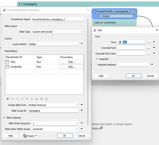 De meest standaard pagina is de voorpagina als eerste slide. De slide is voorzien van een titel, ondertitel en twee logos. De titel en ondertitel worden opgebouwd op basis van de (automatisch) meegegeven parameters zoals het project en huidige datum. Bij de PowerPointStyler transformer heeft een kenmerk Layout Name die verwijst naar de indeling uit de powerpoint template (zie volgende paragraaf). Hier zijn verschillende placeholders aanwezig, waaronder de Titel en Ondertitel. Door achter de ingestelde placeholder voor het type Text te kiezen en vervolgens op Edit te drukken, is het vooraf gemaakte attribuut titel te kiezen als tekst. Hetzelfde is gedaan voor de ondertitel.