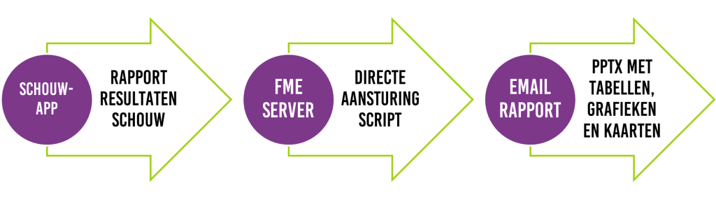 FME Server pakt de aanvraag vanuit de schouwapp direct op. De workspace is daarbij voorzien van een aantal parameters die vanuit de app worden meegegeven. Denk aan het gekozen project, de datum, gebruiker die het rapport maakt, de taal en eventueel een verwijzing naar de sfeerfoto.