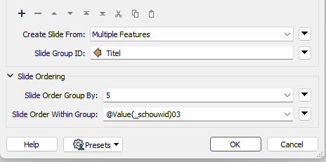 - Door met dynamische Slide Group ID’s en Slide orders te werken binnen de PowerPointStyler kun je ook bij gegroepeerde, vaker terugkomende slides de volgorde precies bepalen. Zo wordt in onderstaand screenshot de Group ID bepaald door de titel, in dit geval naam van één schouwlocatie. Aangezien iedere schouwlocatie (afhankelijk van het aantal foto’s) 1 tot 7 slides kan bevatten, is ook de volgorde binnen die groep bepaald met een dynamisch volgnummer op basis van het unieke ID van die schouwlocatie.