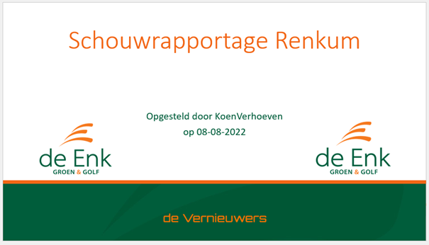 De Enk Groen en Golf heeft het platform Greenviewer ontwikkeld om alle processen en werkzaamheden zo veel mogelijk te automatiseren en digitaal uit te voeren. Eén van de onderdelen die hierbij is ontwikkeld is een app voor het uitvoeren van een schouw op beeldkwaliteit. Het maakt daarbij niet uit wat voor soort project het is; iedere schouwmethodiek kan in de app worden gebruikt. Denk aan de CROW beeldkwaliteit voor de openbare ruimte, of het beeldkwaliteitshandboek voor golfbanen van de NGF.