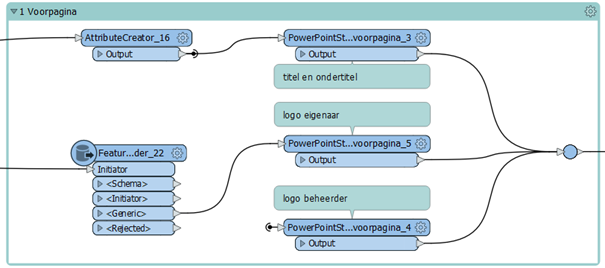 De workspace voor het maken van het volledige rapport is erg uitgebreid. FME heeft mooie opties met specifieke transformers om met Powerpoint te kunnen werken, maar om de inhoud precies aan de wensen te laten voldoen zijn soms uitgebreide bewerkingen nodig. De belangrijkste elementen van de workspace heb ik hieronder beschreven aan de hand van wat simpele voorbeelden.